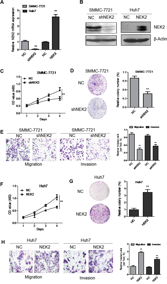 Figure 3: NEK2 accelerates proliferation, colony formation, migration and invasion of HCC cells in vitro. (A) Quantitative real time PCR analysis of NEK2 expression in SMMC7721-NEK2shRNA cells and Huh7-NEK2 cells compared to controls. (B) Western blot analysis of NEK2 expression in SMMC7721-NEK2shRNA cells and Huh7-NEK2 cells compared to controls is shown. NEK2 shRNA downregulated NEK2 in the SMMC7721-NEK2shRNA cells compared to the controls; NEK2 overexpression plasmid upregulated NEK2 by in Huh7-NEK2 cells. (C) MTT assays show that NEK2 downregulation decreased cell proliferation in SMMC7721-NEK2 shRNA cells. (D) Colony formation assays indicate significantly decreased the number of colonies in the SMMC7721-NEK2shRNA cells compared to control SMMC7721 cells. (E) Transwell migration and invasion of SMMC7721-NEK2 shRNA cells were significantly lower than the control SMMC7721 cells. (F) MTT assays show that Huh7-NEK2 cell demonstrated enhanced cell proliferation compared to the control Huh7 cells. (G) Colony formation assays indicate the Huh7-NEK2 cells formed higher number of colonies compared to control Huh7 (NC) cells. (H) Transwell migration and invasion of Huh7-NEK2 cells is significantly elevated compared with control Huh7 cells. All experiments were repeated thrice. *P < 0.05, compared to control.
