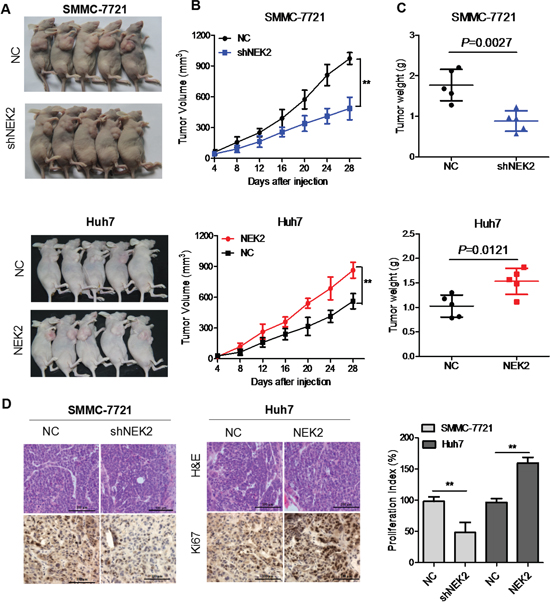 Figure 4: NEK2 promotes HCC tumor growth in vivo. (A) Representative images of day 28 tumors in mice transplanted with SMCC7721-shNEK2, SMCC7721 (control), Huh7-NEK2 and Huh7 (control) cells. (B) Plots showing tumor growth measurements of SMCC7721-shNEK2, SMCC7721 (control), Huh7-NEK2 and Huh7 (control) cells is shown. (C) The mean tumor weights in each group (SMCC7721-shNEK2, SMCC7721 (control), Huh7-NEK2 and Huh7 (control)) on day 28 is shown. (D) IHC staining showing that cell proliferation (Ki67-positive) positively correlates with NEK2 expression levels. Data in (B) and (C) are presented as mean ± SD (n=5). *P < 0.05 versus control.