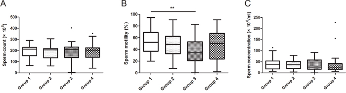 We compared the subjects’ sperm characteristics in different groups and found that the sperm motility was lower in Group 3 (P < 0.01), while the differences of other sperm characteristics didn’t reach a statistically significant level (Figure 1, Supplementary Figure 1).