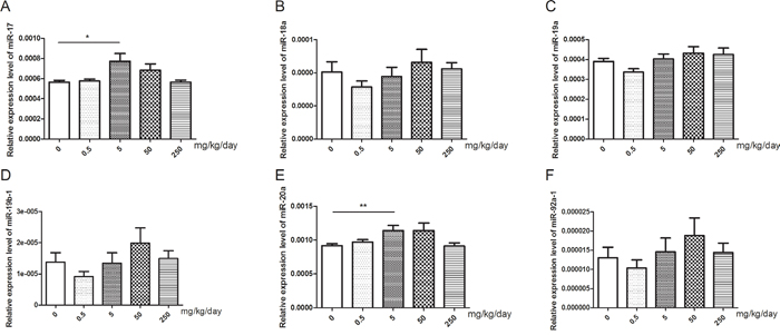 After treatment with GEN, we found that the relative expression levels of miR-17 and miR-20a were significantly increased at the dose of 5 mg/kg/day (Figure 4, P < 0.05, P < 0.01, respectively). But the relative expression levels of miR-18a, miR-19a, miR-19b-1, and miR-92a-1 did not show significantly changed after treatment with GEN (Figure 4).
