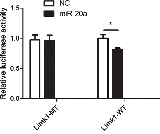 To investigate whether miR-20a directly bind to the 3’UTR regions of Limk1, we performed dual-luciferase report assay by constructing the mutant and wild type luciferase reporter plasmids containing the binding region of the 3’UTR of Limk1 mRNA. We found that co-transfection of miR-20a mimics and pGL3-Limk1 3’UTR reporter plasmids significantly decreased the luciferase activity in 293T cells compared to the control (Figure 6, P < 0.01). This result suggested that miR-20a could directly target Limk1.