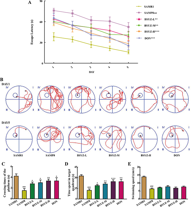 Figure 1: BSYZ ameliorates aging-induced cognitive dysfunction by Morris water maze test in SAMP8 mice. (A) Escape latency of five consecutive days test. (B) The swimming paths of respective groups on the first and fifth day. (C) Crossing times of the target platform in the probe trial. (D) Time spent in the target quadrant in the probe trial. (E) The swimming speed in the probe trial. BSYZ-L: Bushen-Yizhi (1.46 g/kg/d); BSYZ-M: Bushen-Yizhi (2.92 g/kg/d); BSYZ-H: Bushen-Yizhi (5.84 g/kg/d); DON: donepezil. Data represent mean ± SEM (n = 20 per group). ###P < 0.001 vs. SAMR1; *P < 0.05, **P < 0.01, ***P < 0.001 vs. SAMP8.