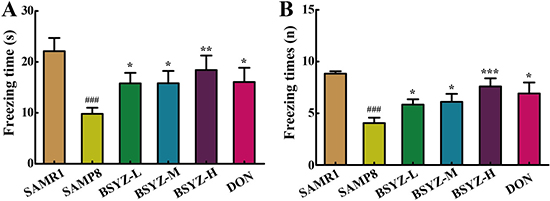 In fear conditioning test (FCT), differences were observed between SAMR1 and SAMP8 group in both the contextual and the cued recall paradigms. SAMP8 group presented less freezing time and freezing times (p < 0.001, Figure 2A and 2B). These were ameliorated after treatment of BSYZ and DON. These results demonstrated that treatment with BSYZ remarkably reversed the cognitive deficits in SAMP8 mice.