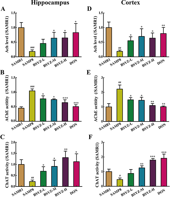 To illuminate the potential mechanism of BSYZ in ameliorating cognition deficiency in SAMP8 mice, the activities of cholinergic marker enzymes and the level of acetylcholine (Ach) were detected. A remarkable increase of acetylcholinesterase (AChE) activity in SAMP8 both in hippocampus and cortex (p < 0.001, p < 0.01, Figure 3B and 3E), while the treatment with BSYZ and DON significantly decreased the AChE activity. The activity of choline acetyltransferase (ChAT) and concentration of Ach in SAMP8 group was decreased sharply in both hippocampus and cortex, whereas BSYZ and DON enhanced the activity of ChAT and increased the concentration of Ach significantly (Figure 3A, 3C, 3D and 3F). Thus, BSYZ could protect cognitive deficits by influencing cholinergic nervous system.