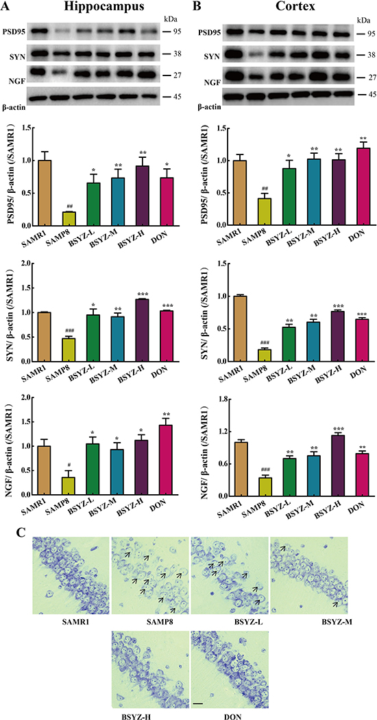 Figure 5: BSYZ ameliorates neurodegeneration in SAMP8 mice. Western blot analysis of postsynapticdensity 95 (PSD95), synaptophysin (SYN) and nerve growth factor (NGF) in hippocampus (A) and cortex (B). (C) Nissl’s staining in parietal hippocampus. Scale bar: 50 μm. BSYZ-L: Bushen-Yizhi (1.46 g/kg/d); BSYZ-M: Bushen-Yizhi (2.92 g/kg/d); BSYZ-H: Bushen-Yizhi (5.84 g/kg/d); DON: donepezil. Data represent mean ± SEM (n = 20 per group). #P < 0.05, ##P < 0.01, ###P < 0.001 vs. SAMR1; *P < 0.05, **P < 0.01, ***P < 0.001 vs. SAMP8.