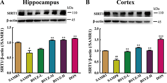 Figure 6: BSYZ up-regulates SIRT1 protein expression in SAMP8. Western blot analysis of the expression of Sirtuin 1 (SIRT1) and quantitative data in hippocampus (A) and cortext (B). BSYZ-L: Bushen-Yizhi (1.46 g/kg/d); BSYZ-M: Bushen-Yizhi (2.92 g/kg/d); BSYZ-H: Bushen-Yizhi (5.84 g/kg/d); DON: donepezil. Data represent mean ± SEM (n = 20 per group). #P < 0.05, ##P < 0.01, vs. SAMR1; **P < 0.01, ***P < 0.001 vs. SAMP8.
