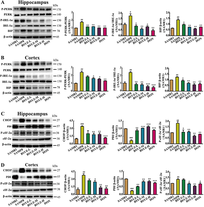 As shown in Figure 6, the expression of SIRT1 decreased in both hippocampus and cortex (p < 0.05, p < 0.01), but increased in BSYZ (middle- and high-dose) and DON group (p < 0.01). Next we measured the protein levels of the two ER stress transducers, PERK and IRE-1α and the expression of chaperones BIP (Figure 7A and 7B). There was an increase in active forms of the effectors of UPR (P-PERK, P-IRE-1α) and BIP in SAMP8 group as compared with the SAMR1, while decreased after the administration of BSYZ. To further evaluate the consequences of ER stress, we next measured the expression levels of CHOP, PDI and eIF-1α. Both CHOP and P-eIF-1α in SAMP8 are up-regulated compared with SAMR1, while down-regulated after the intervention of BSYZ. The expression of PDI sharply decreased but increased under the effect of BSYZ and DON both in hippocampus and cortex (Figure 7C and 7D). These results indicated that the effect of BSYZ on protecting cognitive deficits might be related with SIRT1/ER stress pathway in SAMP8 mice.