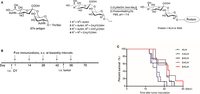 Figure 1: Fluoro-substituted STn vaccines induce efficient antitumor immunotherapy in the presence of adjuvant. (A) Preparation of the glycoconjugates. (B) Schematic representation of the survival study design and immune scheme. One day before the immunization schedule, mice were given intravenous (i.v.) injection of cyclophosphamide (CY) at a dose of 100 mg/kg per mouse. The glycoconjugates in the presence of adjuvant were immunized five times at biweekly intervals and animals were challenged via the tail vein 7 days after the 4th immunization with 2 × 105 CT-26 cells. (C) Survival time of tumor-bearing mice. KLH group (n = 8), 1-KLH group (n = 8), 2-KLH group (n = 8), 3-KLH group (n = 7) and 4-KLH group (n = 7). There is significant difference between 4-KLH group and 1-KLH group. The abscissa represents the time after tumor inoculation.
