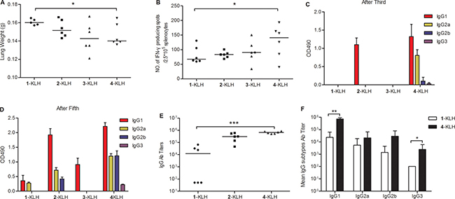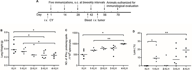 Immunization with 4-KLH led to a significant reduction in tumor burden of lungs compared to treatment with 1-KLH (Figure 6A). The number of IFN-γ-releasing splenocytes after 4-KLH immunization was significantly higher than that of mice vaccinated with 1-KLH (Figure 6B). In the absence of adjuvant, immunization with 4-KLH was still able to inhibit the growth of tumor and establish strong T cell-mediated immunity.