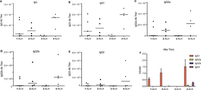 Figure 3: Fluoro-substituted STn vaccines improve the antibody response in the presence of adjuvant. 1-KLH, 2-KLH, 3-KLH and 4-KLH in the presence of adjuvant were immunized five times at biweekly intervals and animals were challenged via the tail vein 7 days after the 4th immunization with 2 × 105 CT-26 cells. The mice were bled by tail vein on day 13 after the third immunization on day 14 after the fifth immunization. (A–E) ELISA tests of anti-STn antibody titers after 5th immunization with antigen. Each data point represents the titer of an individual mouse and the horizontal lines indicate the median for the group of mice. (F) IgG subtypes after immunized with 1-KLH, 2-KLH, 3-KLH and 4-KLH by ELISA with a 1:1000 dilution of pooled sera. The pooled sera obtained from 13 days after the 3rd vaccination. OD490 = optical density at 490 nm. The results in (A–E) are representative of three independent experiments. The results in (F) represent the mean ± standard error of measurement (SEM) of at least two experiments.