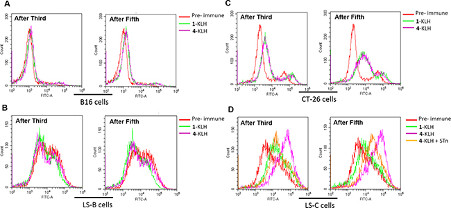 Figure 4: The antisera elicited by 4-KLH vaccine in the presence of adjuvant can recognize cancer cells expressing the native STn antigen. 1-KLH and 4-KLH were immunized five times at biweekly intervals and animals were challenged via the tail vein 7 days after the 4th immunization with 2 × 105 CT-26 cells. The mice were bled by tail vein on day 13 after the third immunization and on day 14 after the fifth immunization. Serological IgG analysis results on B16 cells (A), LS-B cells (B), CT-26 cells (C) and LS-C cells (D) after the third and the fifth immunization with 1-KLH and 4–KLH by flow cytometry. (D) The competitive inhibition of serum recognition of LS-C cells using carbohydrate STn (compound 1) as inhibitor. The results are representative of at least two independent experiments.
