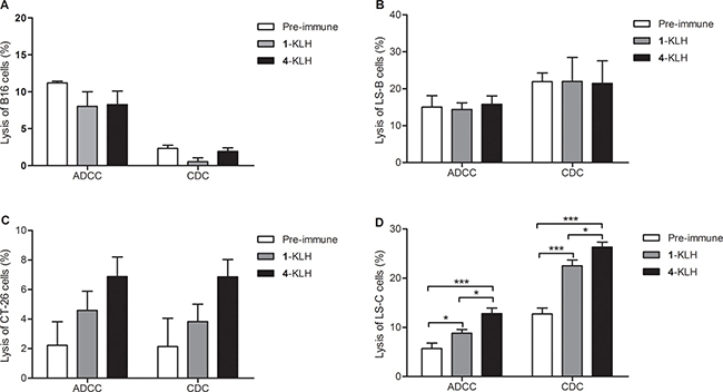 Figure 8: The antisera elicited by 4-KLH vaccine in the absence of adjuvant can kill cancer cells expressing the native STn antigen by ADCC and CDC assays. Target cell B16 cells (A), LS-B cells (B), CT-26 cells (C) and LS-C cells (D) were incubated with the pooled sera from different vaccinated mice after 5th immunizations for 2 h at 37°C, and then incubated with effectors. Cell lysis was evaluated by LDH assay. The results represent the mean ± SEM of at least three experiments. *p < 0.05 and ***p < 0.001.