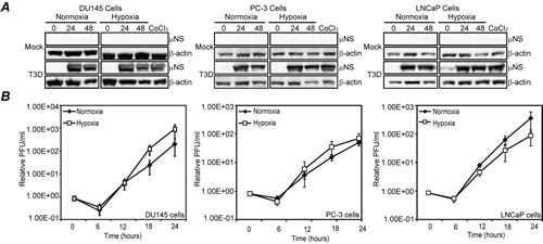 Figure 1: Hypoxia does not interfere with MRV translation or replication in prostate tumor cells. Normoxic or hypoxic DU145, PC-3 and LNCaP prostate tumor cells were mock-infected or infected with MRV T3D and further incubated under normoxic or hypoxic conditions. CoCl2 was added to cells where indicated at 4 h prior to infection. A) At indicated times, cells were harvested and proteins were separated on SDS-PAGE and transferred to nitrocellulose. Blots were immunostained with rabbit α-µNS polyclonal antiserum or rabbit β-actin polyclonal antibodies followed by AP-conjugated goat α-rabbit IgG secondary antibodies. B) At 0, 6, 12, 18, and 24 h p.i., cells were harvested and subjected to three freeze/thaw cycles. Standard virus plaque assays on L929 cells were performed on cell lysates to determine virus titer (PFU). Mean of the relative PFU/ml from three independent experiments is plotted and the error bars represent the standard deviation (SD).