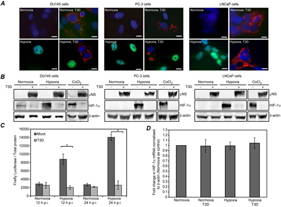 Figure 2: MRV infected hypoxic prostate tumor cells contain diminished HIF-1α protein levels. A) Normoxic or hypoxic DU145, PC3, and LNCaP cells were mock-infected or infected with MRV T3D and further incubated under normoxic or hypoxic conditions. 24 h p.i., cells were fixed, permeabilized, and immunostained with rabbit µNS antiserum (red) and mouse HIF-1α antibodies (green) followed by donkey α-rabbit Alexa 594- and donkey α-mouse Alexa 488-conjugated secondary antibodies. A merged image with DAPI is shown. Bar, 10 µm. B) Normoxic or hypoxic DU145, PC3 and LNCaP cells were mock-infected or infected with MRV T3D and further incubated under normoxic or hypoxic conditions. 4 h prior to infection, CoCl2 was added to cells where indicated. At 24 h p.i., cells were harvested and proteins were separated on SDS-PAGE and transferred to nitrocellulose. Blots were immunostained with rabbit α-µNS antiserum, mouse α-HIF-1α antibodies, or rabbit α-β-actin antibodies followed by AP-conjugated goat α-rabbit or mouse secondary antibodies . C) DU145 cells were transfected with pHRE-Luc and incubated under normoxic or hypoxic conditions. 24 h post-transfection, cells were mock-infected or infected with MRV T3D and further incubated in normoxic or hypoxic conditions. At 12 or 24 h p.i., luciferase activity and total protein were measured. Relative amounts of luciferase per total protein are shown. Error bars represent SD of three independent experiments. Statistically significant differences (p<0.05) are marked with ‘*’. D) DU145 cells were mock-infected or infected with MRV T3D and incubated under normoxic or hypoxic conditions. 24 h p.i., total RNA was isolated and measured using qPCR. Data from three independent experiments are represented as mean ± standard error of the mean (SEM).