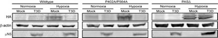 Figure 4: PAS domain region of HIF-1α is required for its MRV-induced down-regulation. PC-3 cells were transfected with pHA-HIF-1α, pHA-HIF-1α P402A/P564A or pHA-HIF-1α ∆PAS and incubated under normoxic or hypoxic conditions. At 24 h post-transfection cells were mock infected or infected with MRV T3D and further incubated under normoxic or hypoxic conditions. At 12 h p.i., cells were harvested and proteins were separated on SDS-PAGE and transferred to nitrocellulose. Blots were immunostained with mouse α-HA antibodies, rabbit α-β-actin or rabbit α-µNS antiserum followed by AP-conjugated goat α-rabbit or mouse secondary antibodies.