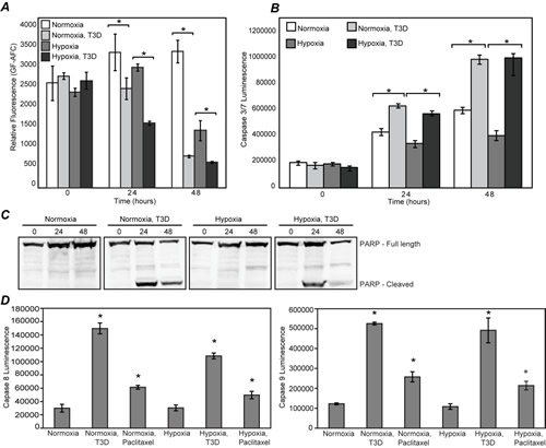 Figure 6: MRV kills hypoxic prostate tumor cells via apoptosis. Normoxic or hypoxic DU145 cells were mock-infected or infected with MRV T3D and further incubated in normoxic or hypoxic conditions. A) At 0, 24 and 48 h p.i., cells were subjected to viability assay. B) At 0, 24, and 48 hours, cells were lysed and caspase 3/7 activity was measured. Error bars represent SD of three experimental replicates. Statistically significant differences (p<0.05) are marked with ‘*’. C) At 0, 24, and 48 hours, cells were lysed, and immunoblotted with antibodies against PARP. D) At 24 h p.i., cells were lysed and caspase 8 or caspase 9 activities was measured. Error bars represent SD of three experimental replicates. Statistically significant differences (p<0.05) are marked with ‘*’.