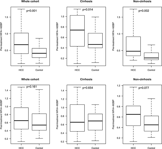Figure 1 shows the pre-treatment and post-treatment WFA+-M2BP levels between the HCC and control groups for the whole cohort and also according to cirrhosis status.