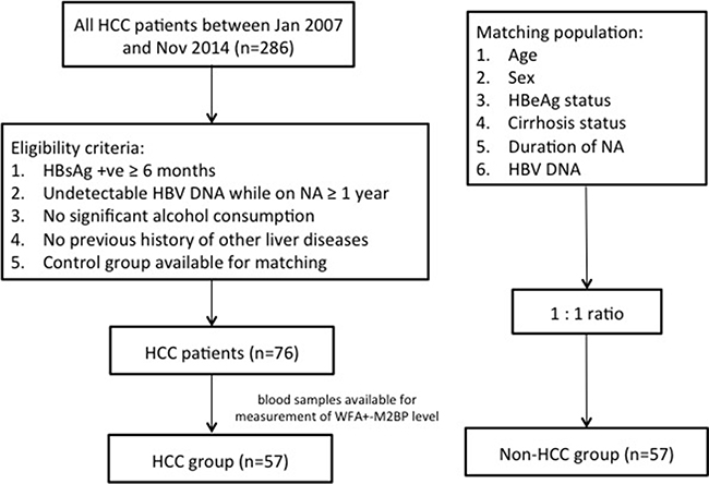 Control subjects were NA-treated CHB patients without HCC development. These control patients were matched with the HCC patients by age, gender, hepatitis e antigen (HBeAg) status, cirrhosis status (definition mentioned below) and duration of NA therapy in a 1:1 ratio. Figure 3 shows the flow diagram of the patient recruitment process.