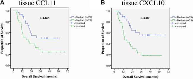 To compare cytokine levels with regard to their prognostic impact, the median was used as a cut-off. No factors were found to have prognostic relevance in the patients’ serum, though high IL-6 levels showed a trend to be associated with worse prognosis (p = 0.124) (Figure 1A). IL-6 levels higher than 50 pg/ml were significantly associated with adverse prognosis (p = 0.004). Also CCL11 levels in the serum might have a prognostic impact, even if results are statistically not significant. Patients with CCL11 levels above the median survived longer (p = 0.069) (Figure 1B). In the tissue specimen two chemokines were associated with prognosis: lower levels of CCL11 (Figure 2A) and CXCL10 (Figure 2B) were associated with better prognosis (p = 0.022 and p = 0.002). Median survival of patients with lower levels of CCL11 was 30.6 months (standard deviation not calculated) while median survival in patients with higher levels was 17.1 ± 5.5 months (6.4–27.7 95% CI). Median survival of patients with lower levels of CXCL10 was not reached at time of the study, 13.8 ± 3.1 (7.9 – 19.8 95%CI) months for patients with higher levels. Combining CCL 11 and CXCL 10 defines a patients subgroup with dismal prognosis if both factors are above the median (median survival 11.9 ± 1.4 months (9.2;14.7 95%CI) versus median survival 28.5 ± 6.0 months (16.8;40.2 months 95% CI) if one factor is above the median. Median survival is not reached in the favourable subgroup of patients with both factors below the median (n = 22). TGF-β3 showed a trend to be associated with prognosis in patients’ tissue (p = 0.102). The median survival and the significant cytokines for all patients are shown in Table 2.