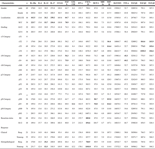 Aim of this study was to investigate relevant cytokines (IL-1Ra, IL-6, IL-12, IL-17, CCL 11 (Eotaxin-1), FGF basic, GM-CSF, IFNγ, CXCL10 (IP-10), MCP-1(MCAF), MIP-1α, MIP-1β, Rantes (CCL5), TNFα, TGFβ-1, -2, and -3.) with regard to patients’ clinicopathological parameters, survival and response to neoadjuvant therapy. As response rates range from 20–50% dependent on the chosen regimen, response prediction could help in clinical practice [8]. Different cytokine profiles predicting response and prognosis could thus support the choice for an appropriate regimen.