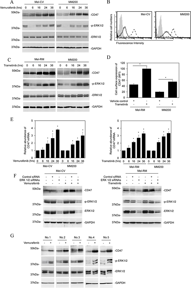 Figure 1: BRAF/MEK inhibitors upregulate CD47 in melanoma cells. (A) Whole cell lysates from Mel-CV and MM200 cells treated with vemurafenib (3 μM) for indicated periods were subjected to Western blot analysis. Data shown are representative of three individual experiments. (B) Representative flow cytometry histograms showing that treatment with vemurafenib (3 μM) for 24 hours upregulated CD47 expression on the surface of Mel-CV and MM200 cells. Data shown are representative of three individual experiments. Filled histograms, isotype control; solid line histograms, before treatment; dotted line histograms, after treatment. (C) Whole cell lysates from Mel-RM and MM200 cells treated with trametinib (1 μM) for indicated periods were subjected to Western blot analysis. Data shown are representative of three individual experiments. (D) Comparison of the cell surface expression of CD47 presented as mean fluorescence intensity (MFI) of CD47 staining in Mel-RM and MM200 cells before and after treatment with trametinib (1 μM) for 24 hours (n = 3, mean ± S.E.M.; Student’s t-test, *P < 0.05). (E) Total RNA.s from Mel-CV and MM200 cells treated with vemurafenib (3 μM) (upper) and from Mel-RM and MM200 cells treated with trametinib (1 μM) (lower) for indicated periods were subjected to qPCR analysis. The relative abundance of CD47 mRNA in individual cell lines before treatment was arbitrarily designated as 1 (n = 3, mean ± S.E.M.; Student’s t-test, *P < 0.05). (F) Mel-CV (left) and Mel-RM (right) cells were transfected with the control or the combination of ERK1 and ERK2 siRNAs. Twenty-four hours later, Mel-CV and Mel-RM cells were respectively treated with vemurafenib (3 μM) and trametinib (1 μM) for a further 24 hours. Whole cell lysates were subjected to Western blot analysis. Data shown are representative of three individual experiments. (G) Whole cell lysates from the indicated fresh melanoma isolates treated with vemurafenib (3 μM) for 24 hours were subjected to Western blot analysis. Data shown are representative of three individual experiments.