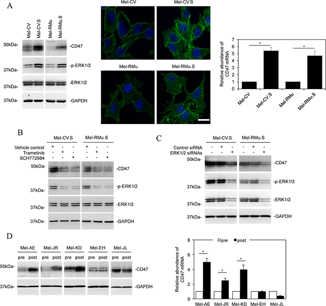 Figure 2: Melanoma cells resistant to vemurafenib express elevated levels of CD47. (A) Left: Whole cell lysates from Mel-CV, Mel-CV.S, Mel-RMu, and Mel-RMu.S cells were subjected to Western blot analysis. Data shown are representative of three individual experiments. Middle: cells of Mel-CV, Mel-CV.S, Mel-RMu, and Mel-RMu.S cells were subjected to immunofluorescence stainning. Right: Total RNAs from Mel-CV, Mel-CV.S, Mel-RMu, and Mel-RMu.S cells were subjected to qPCR analysis. The relative abundance of CD47 mRNA in individual parental cell lines was arbitrarily designated as 1 (n = 3, mean ± S.E.M.; Student’s t-test, *P < 0.05). (B) Whole cell lysates from Mel-CV.S and Mel-RMu.S cells treated with trametinib (1 μM) or SCH772984 (1 μM) were subjected to Western blot analysis. Data shown are representative of three individual experiments. (C) Mel-CV.S and Mel-RMu.S cells were transfected with the control or the combination of ERK1 and ERK2 siRNAs. Twenty-four hours later, whole cell lysates were subjected to Western blot analysis. Data shown are representative of three individual experiments. (D) Left: Whole cell lysates of the indicated paired pre- and post-treatment primary melanoma cultures were subjected to Western blot analysis. Data shown are representative of three individual experiments. Right: Total RNAs from the indicated paired pre- and post-treatment primary melanoma cultures were subjected to qPCR analysis. The relative abundance of CD47 mRNA in individual pre-treatment cultures was arbitrarily designated as 1 (n = 3, mean ± S.E.M.; Student’s t-test, *P < 0.05).