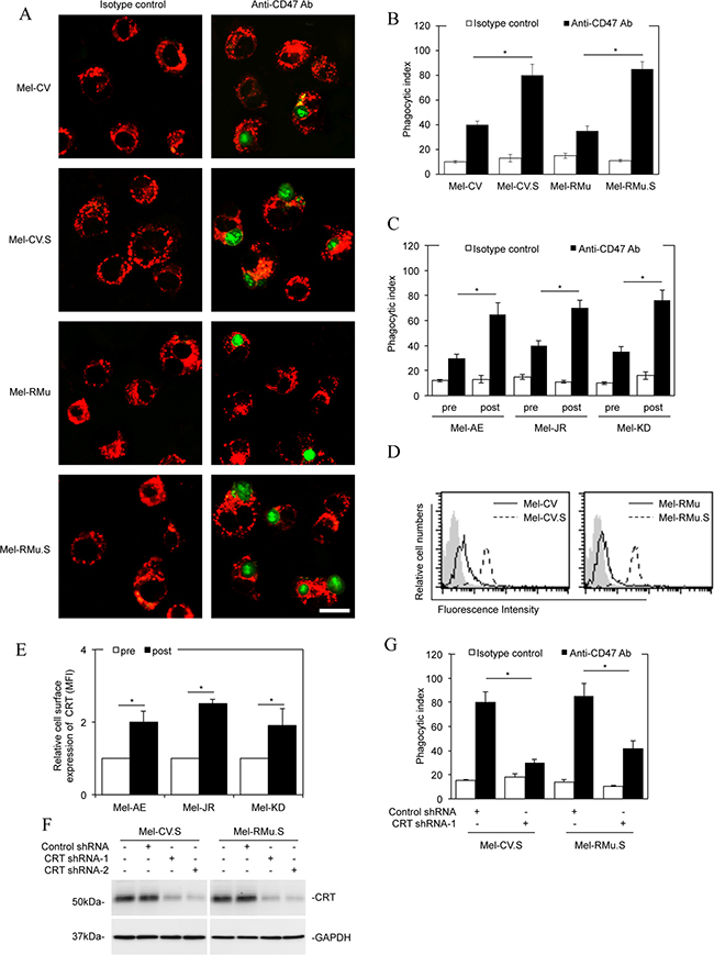 Figure 3: Melanoma cells resistant to vemurafenib are more susceptible to macrophage phagocytosis upon CD47 blockade. (A) CFSE-labelled Mel-CV, Mel-CV.S, Mel-RMu, and Mel-RMu.S cells along with a blocking antibody against CD47 (B6H12.2, 10 μg/ml) were added into cultures of PKH26-labelled PBMC-derived macrophages. Two hours later, cultures were washed and examined with an inverted con-focal microscope. The data shown are representative microphotographs of three individual experiments. Green: CFSE-labelled melanoma cells; red: PKH26-labelled macrophages. Scale bar, 20 uM. (B) Comparison of the phagocytosis index of macrophage against melanoma cells of individual melanoma cell lines. The phagocytosis index was calculated as the number of phagocytized CFSE+ cells per 100 macrophages (n = 3, mean ± S.E.M.; Student’s t-test, *P < 0.05). (C) Comparison of the phagocytosis index of macrophage against melanoma cells of pre- and post-treatment primary cultures (n = 3, mean ± S.E.M.; Student’s t-test, *P < 0.05). (D) Representative flow cytometry histograms showing that Mel-CV.S and Mel-RMu.S expressed higher levels of CRT on the cell surface compared with Mel-CV and Mel-RMu cells, respectively. Data shown are representative of three individual experiments. Filled histograms, isotype control; solid line histograms, Mel-CV or Mel-RMu; dotted line histograms, Mel-CV.S or Mel-RMu.S. (E) Representative flow cytometry showing that CRT were expressed at higher levels on the surface of melanoma cells from post-treatment compared with pre-treatment primary cultures (n = 3, mean ± S.E.M.; Student’s t-test, *P < 0.05). (F) Whole cell lysates of Mel-CV.S and Mel-RMu.S cells transduced with the control or CRT shRNAs were subjected to Western blot analysis. Data shown are representative of three Western blot analyses. (G) Comparison of the macrophage phagocytosis index against Mel-CV.S and Mel-RMu.S with or without CRT knocked down (n = 3, mean ± S.E.M.; Student’s t-test, *P < 0.05).