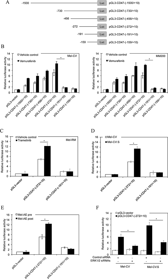 Figure 4: BRAF/MEK inhibitors activate the −272/−191 fragment of the CD47 promoter. (A) A schematic illustration of construction of a series of incremental deletion luciferase reporter constructs. (B) Mel-CV (left) and MM200 (right) cells were transiently transfected with indicated pGL3 basic-based reporter constructs. Twenty-four hours later, cells were treated with vemurafenib (3 μM) for a further 16 hours followed by measurement of the luciferase activity (n = 3, mean ± S.E.M.; Student’s t-test, *P < 0.05). (C) Mel-RM cells were transiently transfected with indicated pGL3 basic-based reporter constructs. Twenty-four hours later, cells were treated with trametinib (1 μM) for a further 16 hours followed by measurement of the luciferase activity (n = 3, mean ± S.E.M.; Student’s t-test, *P < 0.05). (D) Mel-CV and Mel-CV.S cells were transiently transfected with indicated pGL3 basic-based reporter constructs. Twenty-four hours later, cells were subjected to measurement of the luciferase activity (n = 3, mean ± S.E.M.; Student’s t-test, *P < 0.05). (E) Cells of pre- and post-treatment Mel-AE primary cultures were transiently transfected with indicated pGL3 basic-based reporter constructs. Twenty-four hours later, cells were subjected to measurement of the luciferase activity (n = 3, mean ± S.E.M.; Student’s t-test, *P < 0.05). (F) Mel-CV and Mel-CV.S cells were co-transfected with the pGL3-CD47-(−272/+10) and the control or the combination of ERK1 and ERK2 siRNAs. Twenty-four hours later, cells were subjected to measurement of the luciferase activity (n = 3, mean ± S.E.M.; Student’s t-test, *P < 0.05).