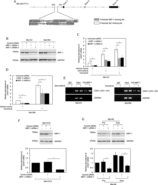 Figure 5: NRF-1 is responsible for transcriptional upregulation of CD47 by BRAF/MEK inhibitors. (A) A schematic illustration of consensus binding sites for the transcription factors Sp1 and NRF-1 at the -272/-191 fragment of the CD47 promoter. (B) Mel-CV and Mel-RM cells were transfected with the control or NRF-1 siRNAs. Twenty-four hours later, whole cell lysates were subjected to Western blot analysis. Data shown are representative of three Western blot analyses. (C) Mel-CV cells were transfected with the control or NRF-1 siRNAs. Twenty-four hours later, cells were treated with vemurafenib (3 μM) or trametinib (1 μM) for a further 16 hours. Total RNAs were subjected to qPCR analysis of CD47 mRNA expression. The relative abundance of CD47 mRNA in cells transfected with the control siRNA was arbitrarily designated as 1 (n = 3, mean ± S.E.M.; Student’s t-test, *P < 0.05). (D) Mel-RM cells were transfected with the control or NRF-1 siRNAs. Twenty-four hours later, cells were treated trametinib (1 μM) for a further 16 hours. Total RNAs were subjected to qPCR analysis of CD47 mRNA expression. The relative abundance of CD47 mRNA in cells transfected with the control siRNA was arbitrarily designated as 1 (n = 3, mean ± S.E.M.; Student’s t-test, *P < 0.05). (E) Formaldehyde-cross-linked chromatin of Mel-CV cells with or without treatment with vemurafenib (3 μM) (left) and Mel-RM cells with or without treatment with trametinib (1 μM) (right) for 16 hours were subjected to immunoprecipitation with an antibody against NRF-1. The precipitates were subjected to PCR amplification using primers directed to the −272/−191 fragment of the CD47 promoter. Data shown are representative of three individual experiments. (F) Upper panel: Mel-CV.S cells were transfected with the control or NRF-1 siRNA (NRF-1 siRNA-1). Twenty-four hours later, whole cell lysates were subjected to Western blot analysis. Data shown are representative of three individual experiments. Lower panel: Mel-CV.S cells were transfected with the control or NRF-1 siRNA (NRF-1 siRNA-1). Twenty-four hours later, total RNAs were subjected to qPCR analysis of CD47 mRNA expression. The relative abundance of CD47 mRNA in cells transfected with the control siRNA was arbitrarily designated as 1 (n = 3, mean ± S.E.M.; Student’s t-test, *P < 0.05). (G) Upper panel: Cells of pre- and post-treatment Mel-AE primary cultures were transiently transfected with the control or NRF-1 siRNA (NRF-1 siRNA-1). Twenty-four hours later, whole cell lysates were subjected to Western blot analysis. Data shown are representative of three individual experiments. Lower panel: Cells of pre- and post-treatment Mel-AE primary cultures were transiently transfected with the control or NRF-1 siRNA (NRF-1 siRNA-1). Twenty-four hours later, total RNAs were subjected to qPCR analysis of CD47 mRNA expression. The relative abundance of CD47 mRNA in cells transfected with the control siRNA was arbitrarily designated as 1 (n = 3, mean ± S.E.M.; Student’s t-test, *P < 0.05).