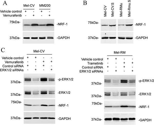 Figure 6: ERK signalling regulates NRF-1 expression in melanoma cells. (A) Whole cell lysates from Mel-CV and MM200 cells with or without treatment with vemurafenib (3 μM) for 16 hours were subjected to Western blot analysis. Data shown are representative of three individual experiments. (B) Whole cell lysates from Mel-CV, Mel-CV.S, Mel-RMu, and Mel-RMu.S were subjected to Western blot analysis. Data shown are representative of three individual experiments. (C) Mel-CV (left) and Mel-RM (right) cells were transfected with the control or the combination of ERK1 and ERK2 siRNAs. Twenty-four hours later, Mel-CV and Mel-RM cells were treated with vemurafenib (3 μM) and trametinib (1 μM), respectively, for a further 24 hours. Whole cell lysates were subjected to Western blot analysis. Data shown are representative of three individual Western blot analyses.