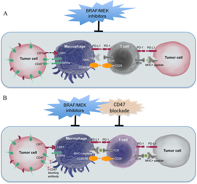 In support of the proposed model, melanoma cells resistant to vemurafenib appeared more susceptible to macrophage phagocytosis, suggesting that these cells are more critically dependent on CD47 for escaping the immune system. When the interaction of CD47 and SIRPα is blocked, a pro-phagocytic signal such as that transmitted by the CRT/ LRP1 system is needed for initiating phagocytosis [17, 18]. Indeed, vemurafenib-resistant melanoma cells expressed higher levels of CRT on the cell surface compared to their parental counterparts, which was responsible for the enhanced macrophage phagocytosis, as knockdown of CRT diminished phagocytosis of the cells by macrophages. It is known that induction of immunogenic cells death triggers exposure of CRT onto the cell surface [28, 29], but this is unlikely to play a role in the increased cell surface expression of CRT in vemurafenib-resistant melanoma cells, as these cells are viable and proliferative [43]. Irrespectively, these results demonstrate that high levels of CD47 are obliged for protection against macrophage phagocytosis of melanoma cells that express increased levels of CRT on the surface after exposure to BRAF/MEK inhibitors (Figure 7).