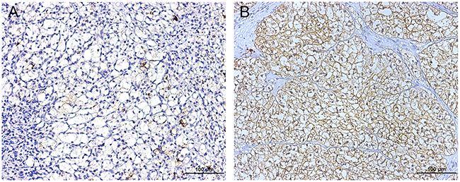 Figure 1: Representative photograph of FUT3 immunostaining in TMA (magnification * 200, scale bar = 100 μm). (A) showed low densities of FUT3 while (B) showed high densities of FUT3.