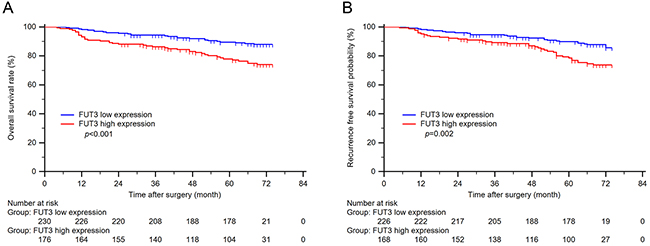 Figure 2: Kaplan-Meier curves of overall survival and recurrence free survival based on tumor FUT3 expression. (A) n = 406, p < 0.001; (B) n = 394, p = 0.002.