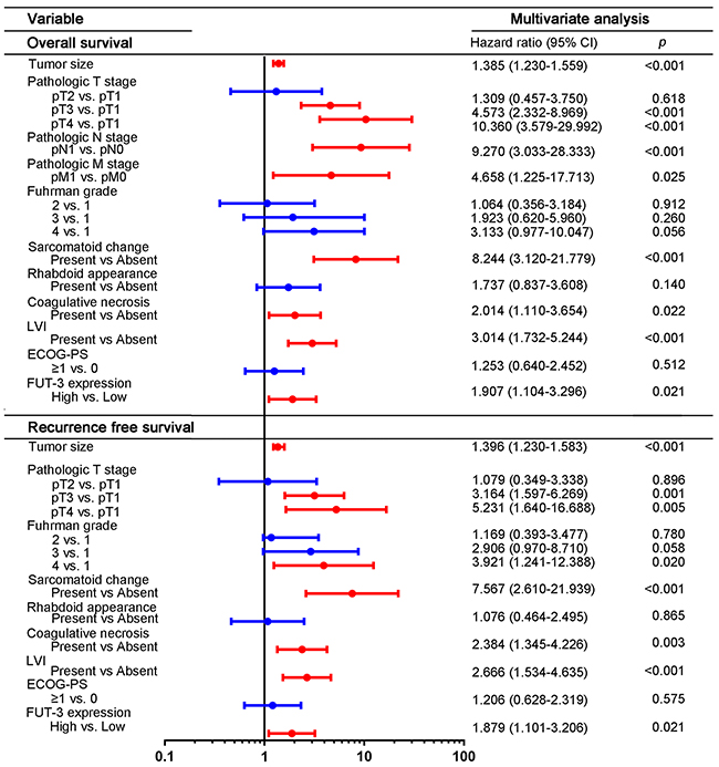X-tile plot analysis was applied to select the suitable cutoff value of the H-score according to the “minimum p value” method, in order to set the patients apart into two subgroups of low and high expression of FUT3 [37]. We evaluated the comparison between the expression of FUT3 and clinical and pathological variables by using the student’s t test, χ 2 test and Wilcoxon rank-sum test. OS curves and RFS curves were generated by Kaplan-Meier method and compared by log-rank t test. Independent associations between OS or RFS and clinicopathologic variables were evaluated by using univariable and multivariable Cox proportional-hazard models. Nomogram was built to predict the prognosis, and its prediction accuracy is evaluated by calibration plot. The predictive accuracy and sufficiency of the models were assessed by Harrell’s Concordance index (C-index) and Akaike’s Information Criteria (AIC). The difference between the C-index was compared by Hanley-McNeil test. The difference was considered significant if the two-side p value was less than 0.05.