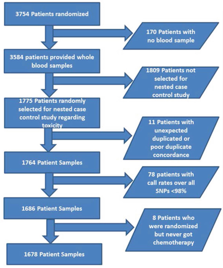 A total of 3754 patients underwent random assignment between September 2005 and March 2007. Whole-blood samples were retrieved from 3584 patients at the time point of randomization. To build a nested case–control study, 887 patients were randomly selected from the group of patients with grade 3 or 4 NLE (cases) and 888 patients from the group of patients without grade 3 or 4 NLE (controls) in the first three cycles of the chemotherapy, resulting in a sample size of 1775 patients for genotyping. Eleven patients were excluded because of duplicate issues, and 78 patients were excluded because less than 98% of all genotyped SNPs could be called. Finally, eight additional patients who had undergone randomization but never started chemotherapy treatment were excluded. The final sample size for this study was therefore 1678. The flow chart of the patient selection process is shown in Figure 1.