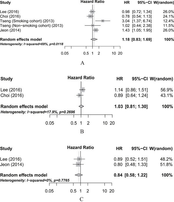 Five studies investigated the impact of insulin use and PC survival and there was no significant association between insulin use and PC survival (HR=1.18, 95% CI=0.83-1.69; Figure 4A). We also did not find significant association between SUs (HR=1.03, 95% CI=0.81-1.30; Figure 4B) or TZDs (HR=0.84, 95% CI=0.58-1.22; Figure 4C) use and PC survival.