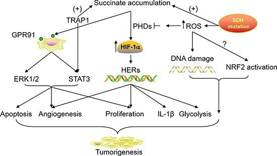 Figure 2: Roles of accumulated succinate in tumorigenesis and progression. SDH mutation and TRAP1 up-regulation in the tumor microenvironment can lead to a high concentration of succinate in the cytoplasm, which subsequently results in HIF stabilization, GPR91 activation and downstream signaling cascades. SDH mutation in the mitochondria also contributes to ROS production. This conversely inhibits the activity of PHDs which facilitate HIF catabolism while the accumulated ROS causes DNA damage and NRF2 activation. The involvement and collaborations of all these possible mechanisms promote cell apoptosis, proliferation and migration in tumor tissues.