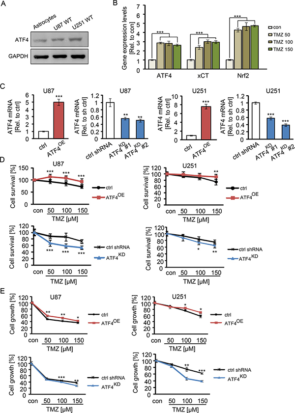 Figure 1: ATF4 induces TMZ resistance in glioma cells. (A) Western blot analysis of ATF4 expression in human primary astrocytes, U87 WT (wild type) cells and U251 WT (wild type) cells. (B) U87 WT cells were subjected to TMZ in a series of concentrations as indicated for 48 h, then ATF4, Nrf2 and xCT mRNA levels were evaluated by RT-PCR. n = 3, ***P < 0.001 compared with con (untreated) using one-way ANOVA. CU87 and U251 cells were transfected with ATF4 cDNA and shRNAs as described in Material and methods. ATF4 mRNA was quantified by real time RT-PCR using the ΔΔCT method with GAPDH. D, ATF4OE and ATF4KD U87 and U251 cells were subjected to TMZ for 3 days in a series of concentrations as indicated. The cell survival was measured by MTT assay. E, After treatment with TMZ for 3 days, the total number of vital cells was monitored. n ≥ 8 per group. Statistical analysis was performed by unpaired Student’s test, *P < 0.05, **P < 0.01, ***P < 0.001, ctrl (peGFP-N1) versus ATF4-GFP or ctrl shRNA versus ATF4 shRNA.