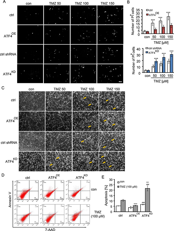 Figure 2: TMZ induces cell death in an ATF4-dependent manner. (A and B) ATF4OE and ATF4KD U87 cells were treated with TMZ at indicated concentrations for 3 days. Cell death was demonstrated by propidium iodide (PI) staining. Scale bar represents 100 μm. n ≥ 3 per group. Statistical analysis was performed by unpaired Student’s test. ***P < 0.001, ctrl (peGFP-N1) versus ATF4-GFP or ATF4 shRNA versus ctrl shRNA. (C) Visualization of ATF4OE and ATF4KD U87 cells treated with TMZ for 3 days. Scale bar represents 100 μm. (D) Cell death analysis was performed by flow cytometer with 7-AAD (late apoptosis) and Annexin V (early apoptosis) staining. (E) Quantification of apoptotic cell death in ATF4OE and ATF4KD U87 cells treated with TMZ. n = 3 per group. Statistical analysis was performed by unpaired Student’s test. **P < 0.01, ***P < 0.001, ctrl versus ATF4-GFP or ctrl shRNA versus ATF4 shRNA; ###P < 0.001, ATF4-GFP versus ATF4 shRNA.