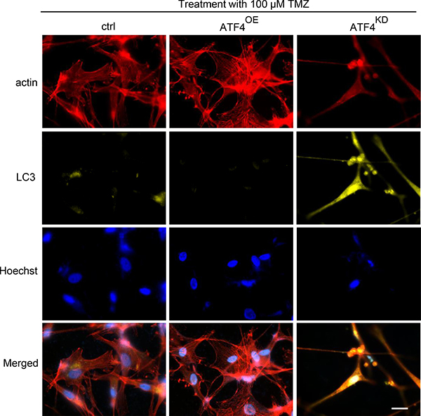 Figure 3: ATF4 counteracts TMZ-induced autophagy in glioma cells. Representative images display actin (red), LC3 (yellow) and nuclei (blue). Autophagic vacuoles were monitored 72 h after 100 μM TMZ treatment. Increased autophagic signs were found in ATFKD gliomas. Scale bar represents 50 μm.