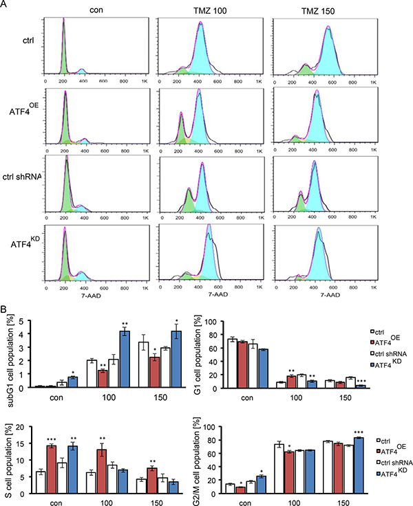 To analyze the TMZ-induced cell death in glioma cells, we monitored the cell cycle profile in ATF4OE and ATF4KD cells using 7-AAD (Figure 4). Noteworthy, 100 μM TMZ induced increased G2/M arrest in glioma cells in a concentration-dependent manner after 3 days of treatment. The cytometric profile also confirmed that ATF4OE cells show a greater cell population in S-phase and reduced numbers of cells in the sub G0-phase and G2/M-phase in comparison with controls and ATF4KD cells (Figure 4A, 4B).