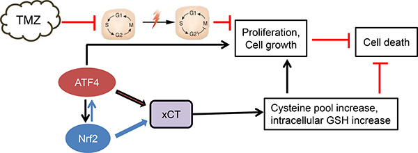 Here, we hypothesized that ATF4 inhibition, although not fully lethal for glioma cells, can weaken the cellular resistance mechanisms against TMZ. The rationale for this assumption is based on the essential function of xCT in glutathione homeostasis.