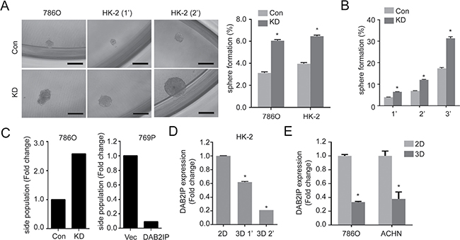 Figure 1: Loss of DAB2IP increases stem-like phenotypes in RCC. (A) Cells were cultured with sphere forming condition in ultra-low attachment plate for 14 days. Spheres were photographed, and the numbers of spheres were counted, and sphere forming ability was calculated based on the original seeding number. Con, control cells; KD, DAB2IP knock-down cells; 1’, the first generation spheres; 2′, the second generation spheres. The asterisk (*) indicates statistical significance (p < 0.01) between KD and Con. (B) Sphere forming ability was determined after serial passages. (C) Cells were stained with Hoechst 33342 and side population (SP) was determined using flow cytometry. (D and E) DAB2IP expressions were compared in HK-2 cells (D), 786O or ACHN RCC cells (E) cultured in monolayer (2D) or sphere condition (3D).