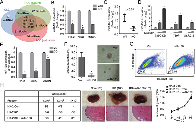 Figure 2: miR-138 is regulated by DAB2IP to suppress stem-like phenotypes in RCC. (A) Potential miRNAs candidates were analyzed from different data sources: DAB2IP-regulated miRNAs (Blue), Screening of tumor suppressive miRNAs from RCC patients (Green) [39], and Profiling of miRNAs during RCC progression (Red) [40]. (B and C) Expression levels of miR-138 were determined in Con vs. KD renal cells (B), and in wild type (WT) vs. DAB2IP knock-out (KO) mice tissues (C). (D) Effect of DAB2IP on the expression levels of miR-138 expression. (E) miR-138 expressions were compared between monolayer (2D) and sphere (3D) culture condition of HK-2, 786O or ACHN cells. (F and G) HK-2 KD cells were transfected with miR-138 expression vector. The sphere forming ability (E), and SP (G) were determined. (H) Cancer-initiating ability of each subline was determined using orthotopic xenograft model after 8 weeks post-injection. Scale bar, 250 μm.