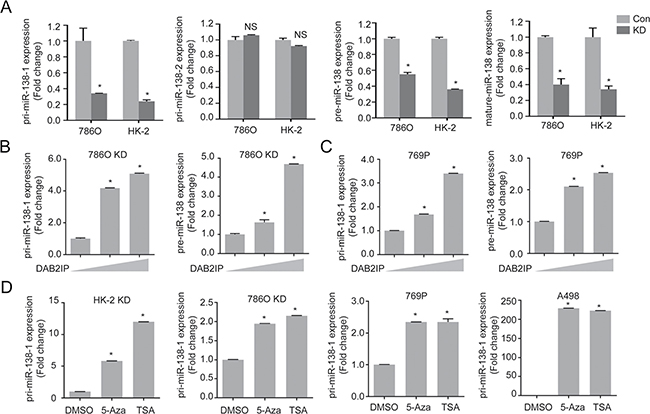 Figure 3: DAB2IP epigenetically regulates miR-138 expression. (A) Expression levels of primary, precursor, and mature miR-138 were compared in 786O and HK-2 sublines (Con, KD). (B and C) 786O KD (B) and 769P (C) cells were transfected with increasing dosage of DAB2IP for 48 h, and relative expressions of primary and precursor miR-138 were analyzed by qRT-PCR. (D) Cells were treated with 5-Aza (5 μM) and TSA (100 nM) for 72 h, and pri-miR138-1 expressions were analyzed.
