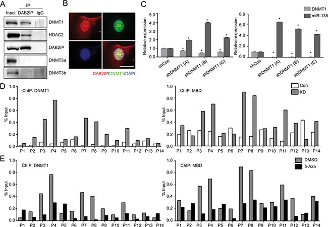Figure 4: DNMT1 suppresses miR-138 expression by direct binding to the promoter region. (A) Nuclear proteins were extracted from wild type 786O cells and interaction of DAB2IP with DNMTs or HDAC2 were validated by IP. (B) Co-localization of DAB2IP and DNMT1 in the nuclei of 786O cell lines was determined by immunofluorescent staining. Scale bar = 25 μm. (C) DNMT1 was knock-downed in 786O KD and 769P cells, and miR-138 expression was measured by qRT-PCR. (D) The status of DNMT1 (left panel) or MBD (right panel) binding to the miR-138 gene promoter region in 786O Con and KD were evaluated by ChIP assay. (E) 786O KD cells were treated with 5-Aza (5 μM) for 72 h, and the effect of 5-Aza treatment on DNMT1 or MBD binding to the miR-138 promoter region were determined by ChIP assay.