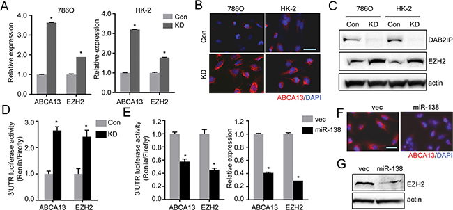 Figure 5: miR-138 targets ABCA13 and EZH2 mRNA via the 3′-UTR regions. (A–C) Expression levels of ABCA13 and EZH2 in RCC cells were analyzed by qRT-PCR (A), or immunofluorescence staining (B), or Western blot analysis (C). (D) Luciferase reporter activities in 786O cells transfected with either ABCA13 or EZH2 3′UTR reporter construct for 48 h. The luciferase reporter activity was measured with the dual luciferase assay. (E) The inhibitory effect of miR-138 on 3′UTR reporter activities or mRNA expression of ABCA13 and EZH2 in HK-2 KD cells were analyzed. (F and G) The protein expressions of ABCA13 (F) and EZH2 (G) were determined in HK-2 KD transfected with miR-138 expression vector.