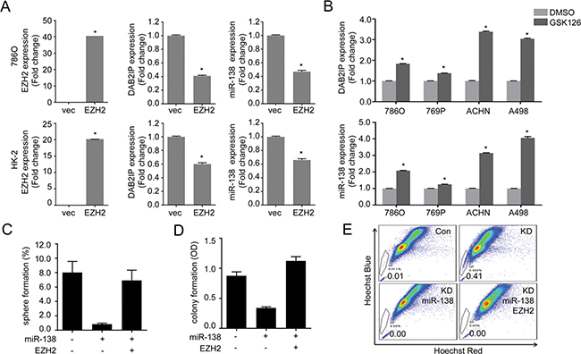 Figure 6: EZH2 plays a critical role in maintaining stem-cell like properties of renal cells. (A) Cells were transfected with EZH2 expression plasmid for 48 h then expression of DAB2IP and miR-138 levels were determined by qRT-PCR. (B) Cells were treated with EZH2 inhibitor GSK126 (1 μM) for 48 h, then DAB2IP and miR-138 expressions were determined. (C–E) Cells were transfected with miR-138 and/or EZH2 expression vector as indicated, the sphere forming ability (C), colony forming ability (D), or SP (E) was determined separately.