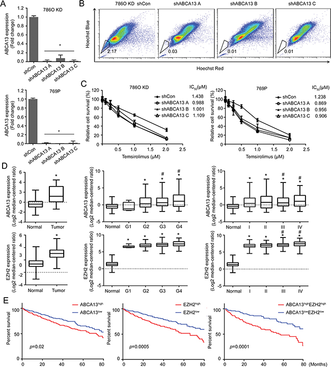 Figure 7: ABCA13 confers drug resistance of RCC and correlates with the overall survival of RCC patients. (A) ABCA13 was knock-downed in 786O KD and 769P cells, and knock down efficiency was measured by qRT-PCR. (B) SPs were determined and compared in 786O KD cells transfected with shCon and shABCA13 plasmid. (C) 786O KD or 769P cells were transfected with shCon or shABCA13 plasmid then treated with Temsirolimus for 72 h and the relative cell survival was measured by MTT assay for determining IC50 using Graphpad Prism. (D) The levels of miR-138, ABCA13 and EZH2 expression in normal versus tumor tissues from TCGA were compared. The asterisk (*) indicates statistical significance (p < 0.05) between tumor and normal; # indicates statistical significance (p < 0.05) between higher grade and G1. (E) Overall survival of high- and low- ABCA13/EZH2 groups from TCGA was analyzed. N = 468, p value was obtained from two-sided log-rank tests.