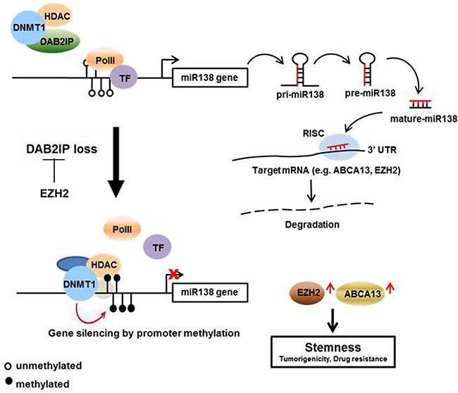 In this study, we newly demonstrated that the loss of DAB2IP in RCC increased stem-like phenotypes such as cancer initiating ability and drug resistance. Previously, we identified DAB2IP is a novel tumor suppressor commonly lost in every subtype of RCC [11]. Here, we further identified DAB2IP-mediated microRNA-138 (miR-138) pathway to target EZH2 and ABCA13 expression that underlined the stem-like phenotypes associated with drug resistance of RCC cells. Clinical evidence showed that miR-138 expression significantly reduced in RCC specimens. Also, overall survival of RCC patients was positively correlated with both EZH2 and ABCA13 expression. A unique function of DAB2IP protein is identified through its direct interaction with epigenetic enzymes such as DNA methyltransferase 1 (DNMT1) and histone deacetylase (HDAC2), which can prevent both enzymes from binding to the miR-138 gene promoter leading to the expression of miR-138. In conclusion, both ABCA13 and EZH2 are key players in eliciting stem-like phenotypes of RCC and potential prognostic markers, which may also provide a new therapeutic strategy against RCC drug resistance.